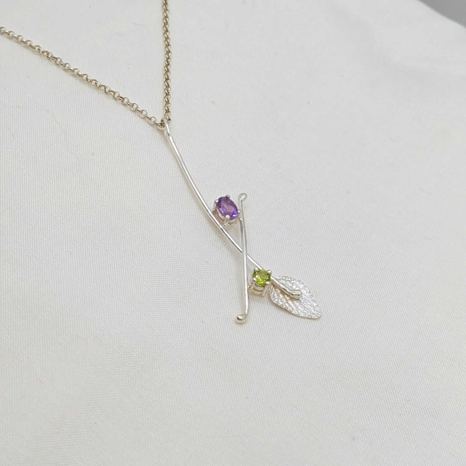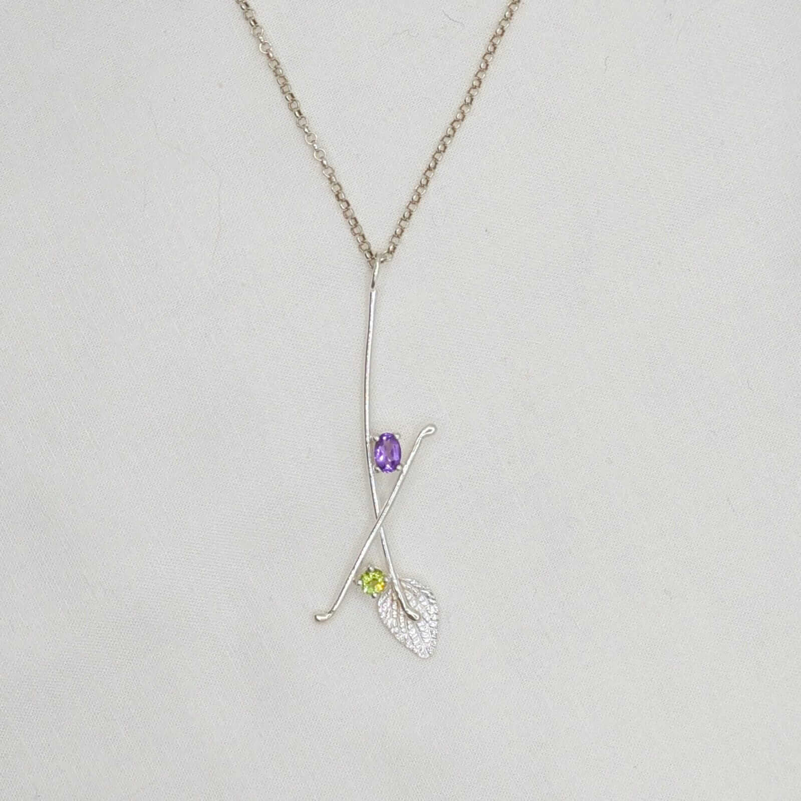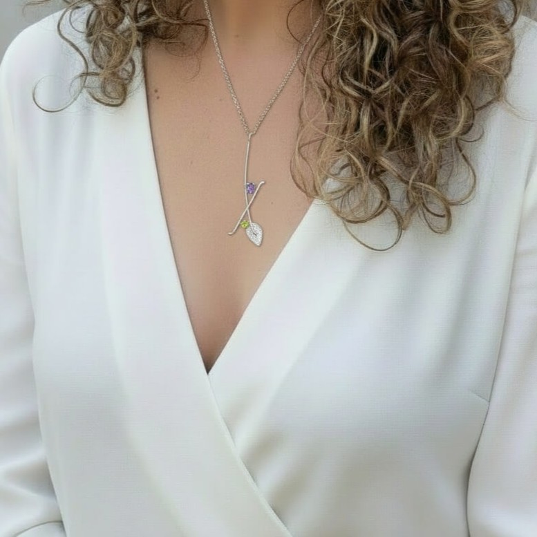 A la part superior, una Ametista aporta un toc de sofisticació, mentre que el Peridot situat més avall afegeix frescor i equilibri al conjunt. El detall final, una fulla texturada en plata, ressalta l’essència orgànica i romàntica de la peça.