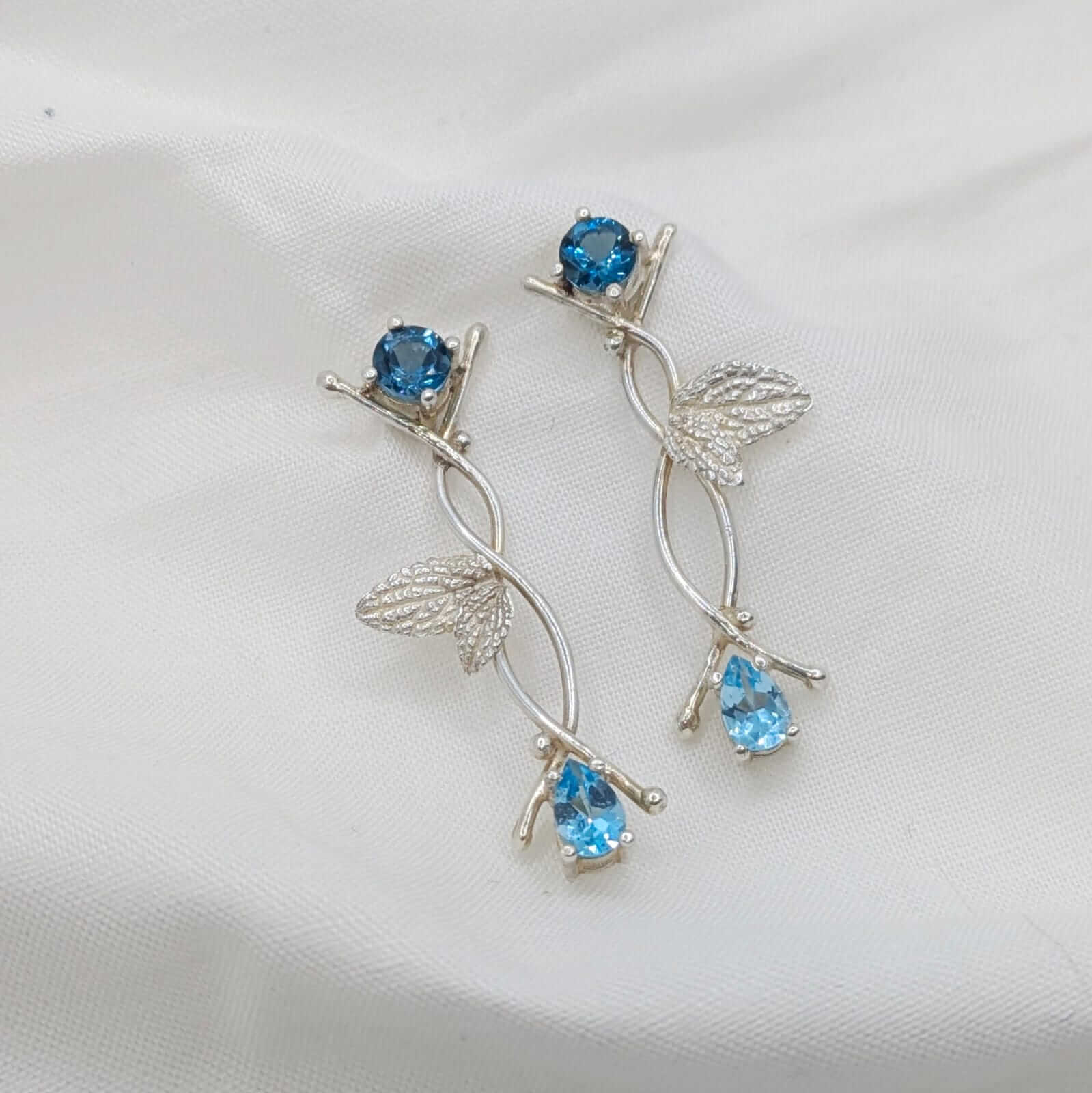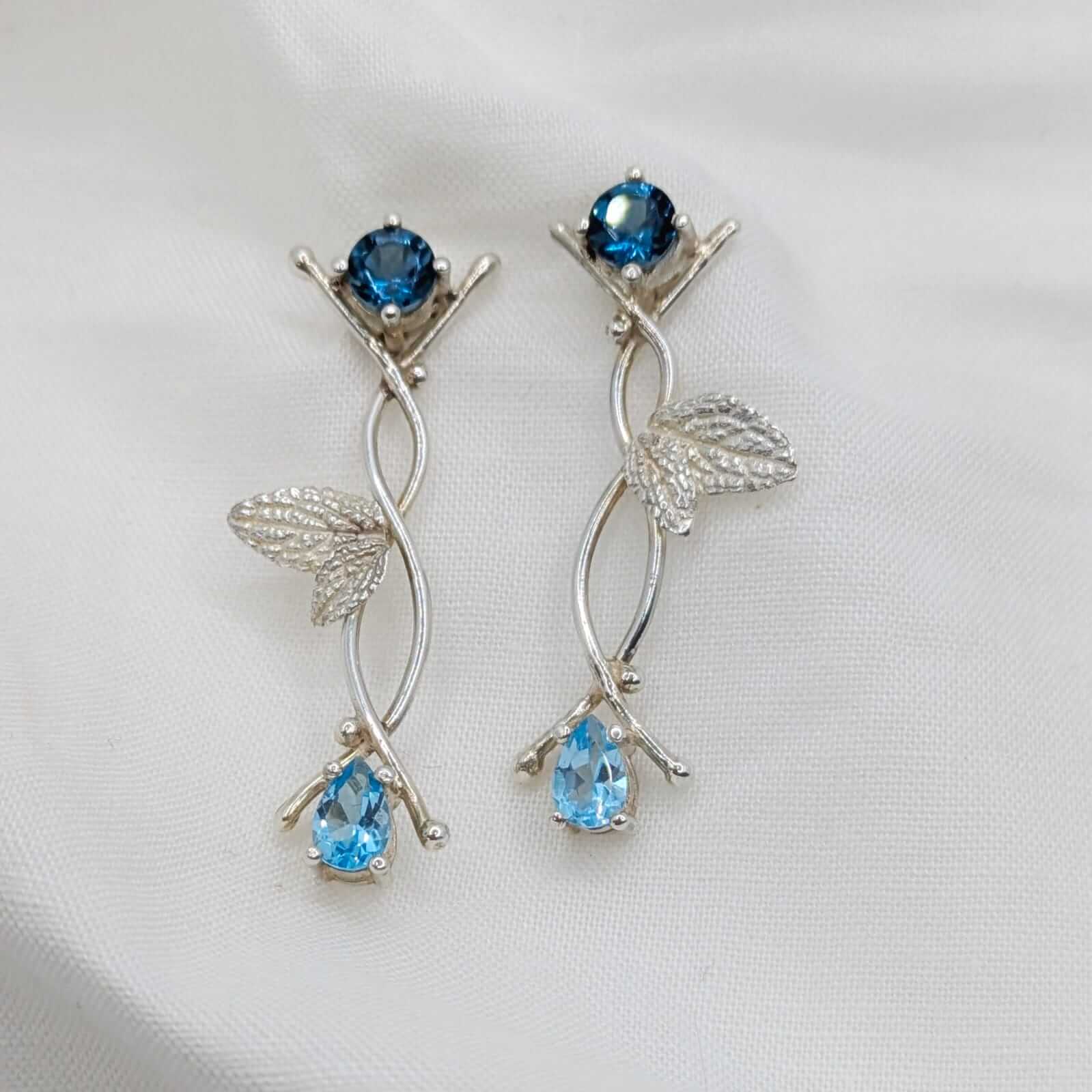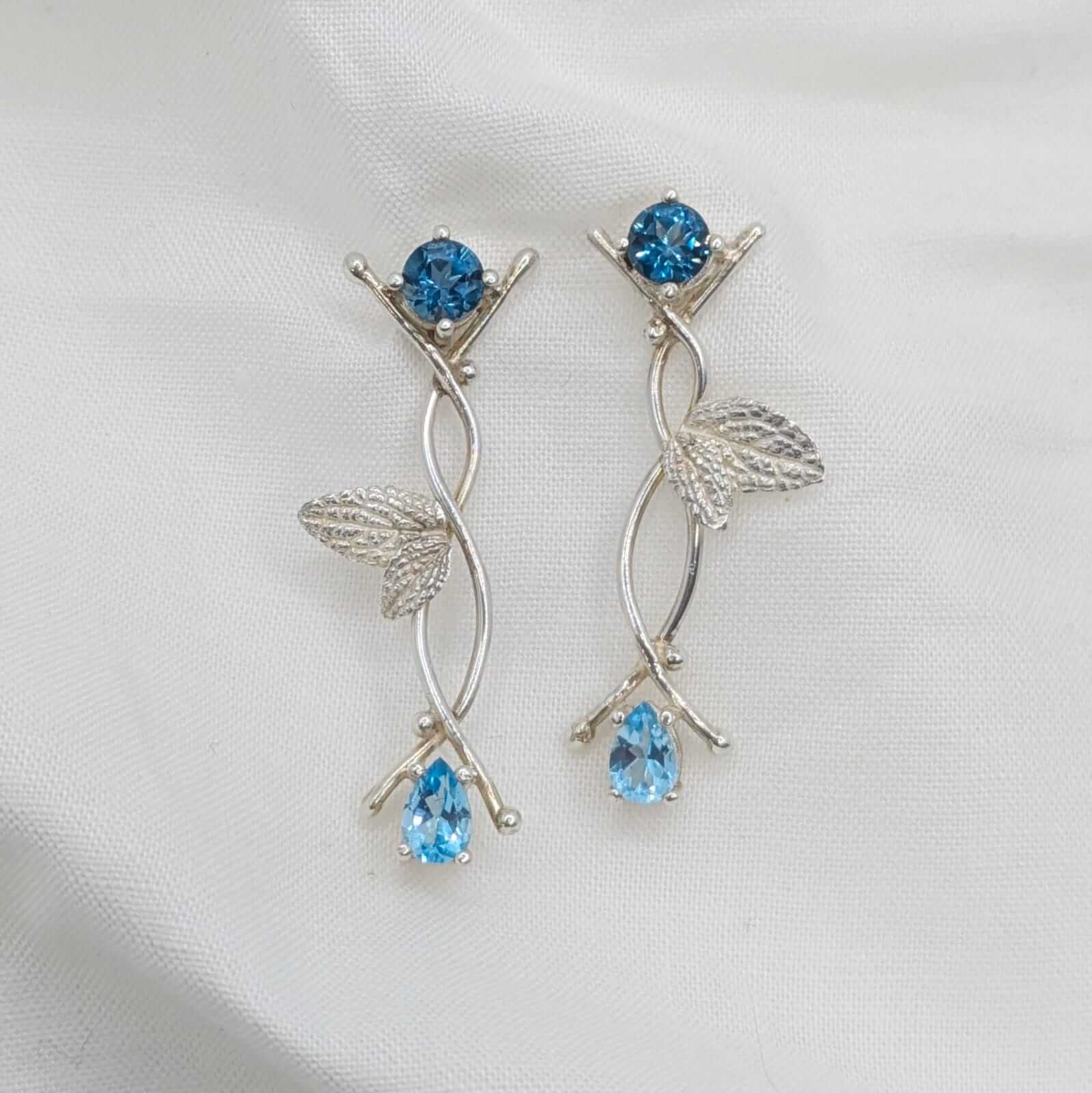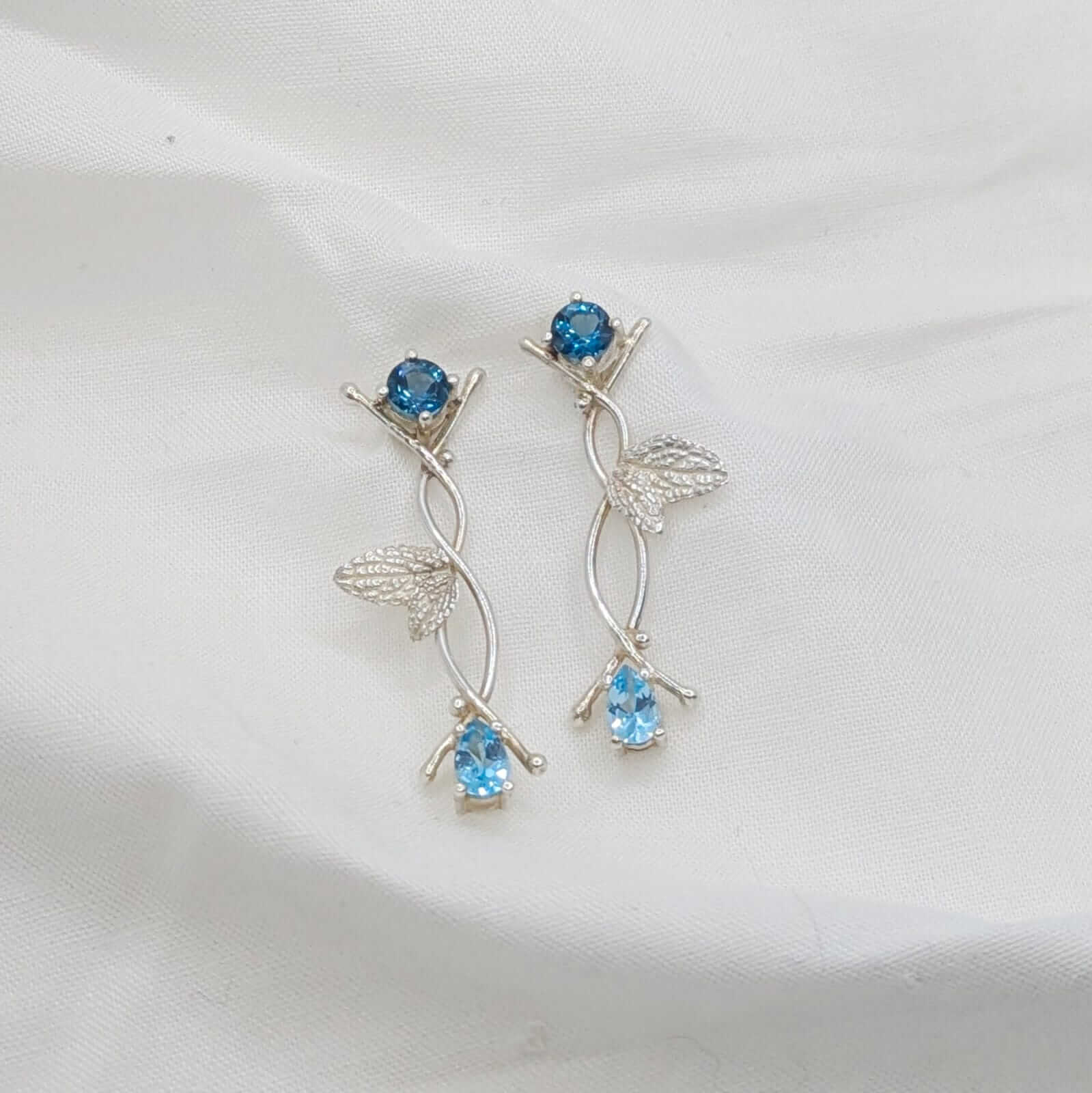 Dues ànimes de topazi, una en blau cel suau i l’altra en blau profund, es troben entre fulles naturals que s’enreden amb delicadesa. Cada pedra brilla com si guardés un secret antic, i el seu contrast crea una dansa serena entre claror i misteri.
