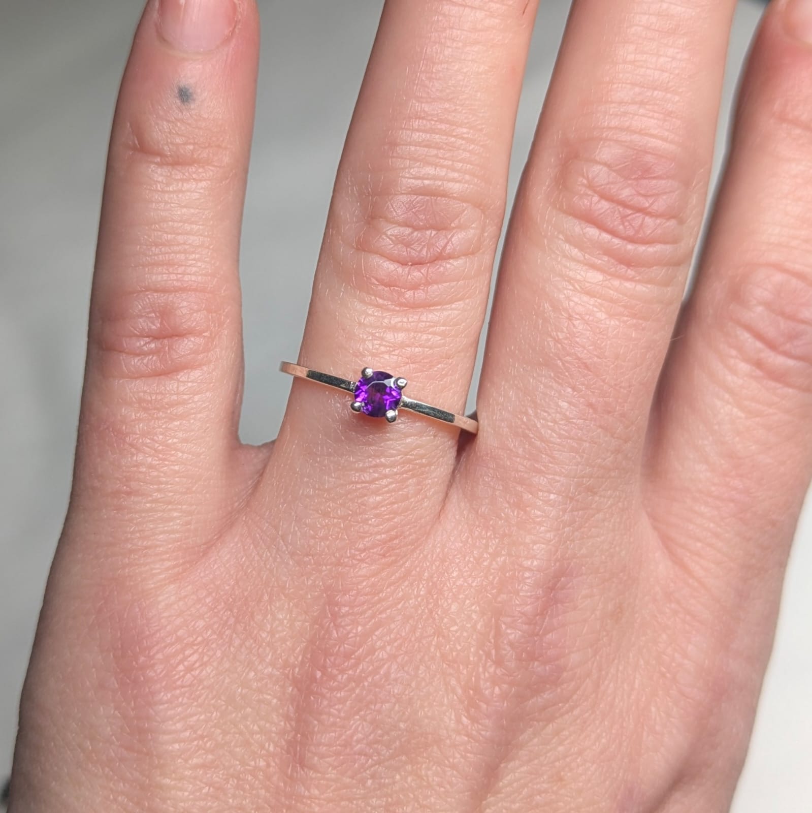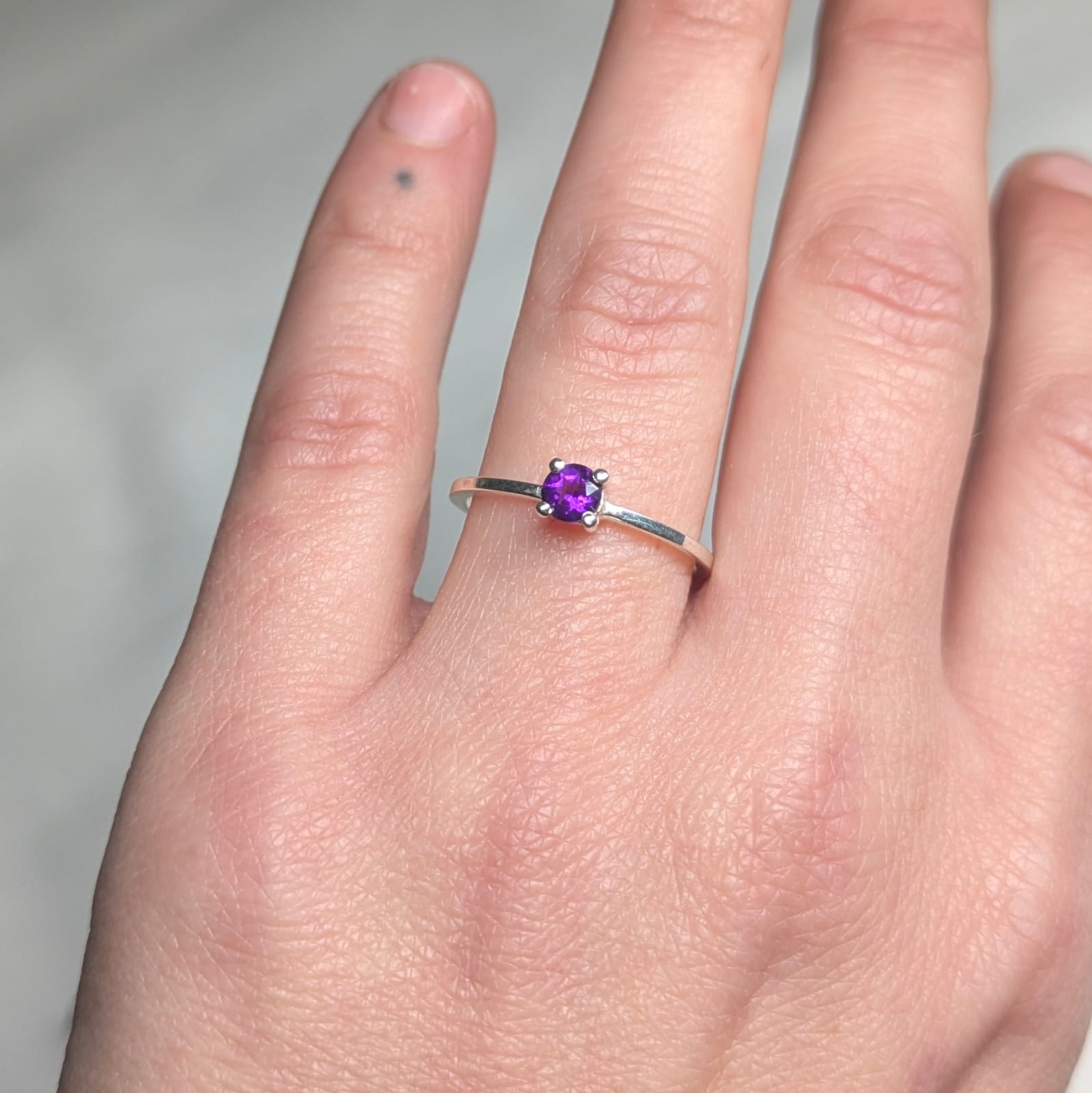 Anell de plata de llei amb ametista de 4mm, una pedra que evoca serenor i intuïció, amb tons violetes que ballen entre la llum i el misteri. La seva presència delicada aporta harmonia i una elegància atemporal.