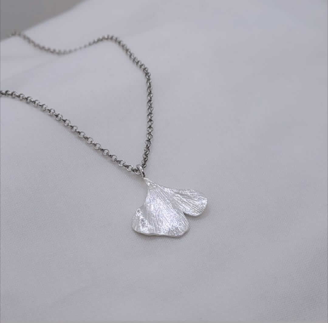 Aquesta peça de plata s’inspira en una fulla de ginkgo biloba caiguda suaument als peus del Monestir de Sant Cugat, un arbre que sembla escoltar el pas del temps amb una paciència infinita. La seva forma en ventall, elegant i ancestral, ha estat transformada en joia per preservar aquell instant breu en què la natura i la història es toquen.