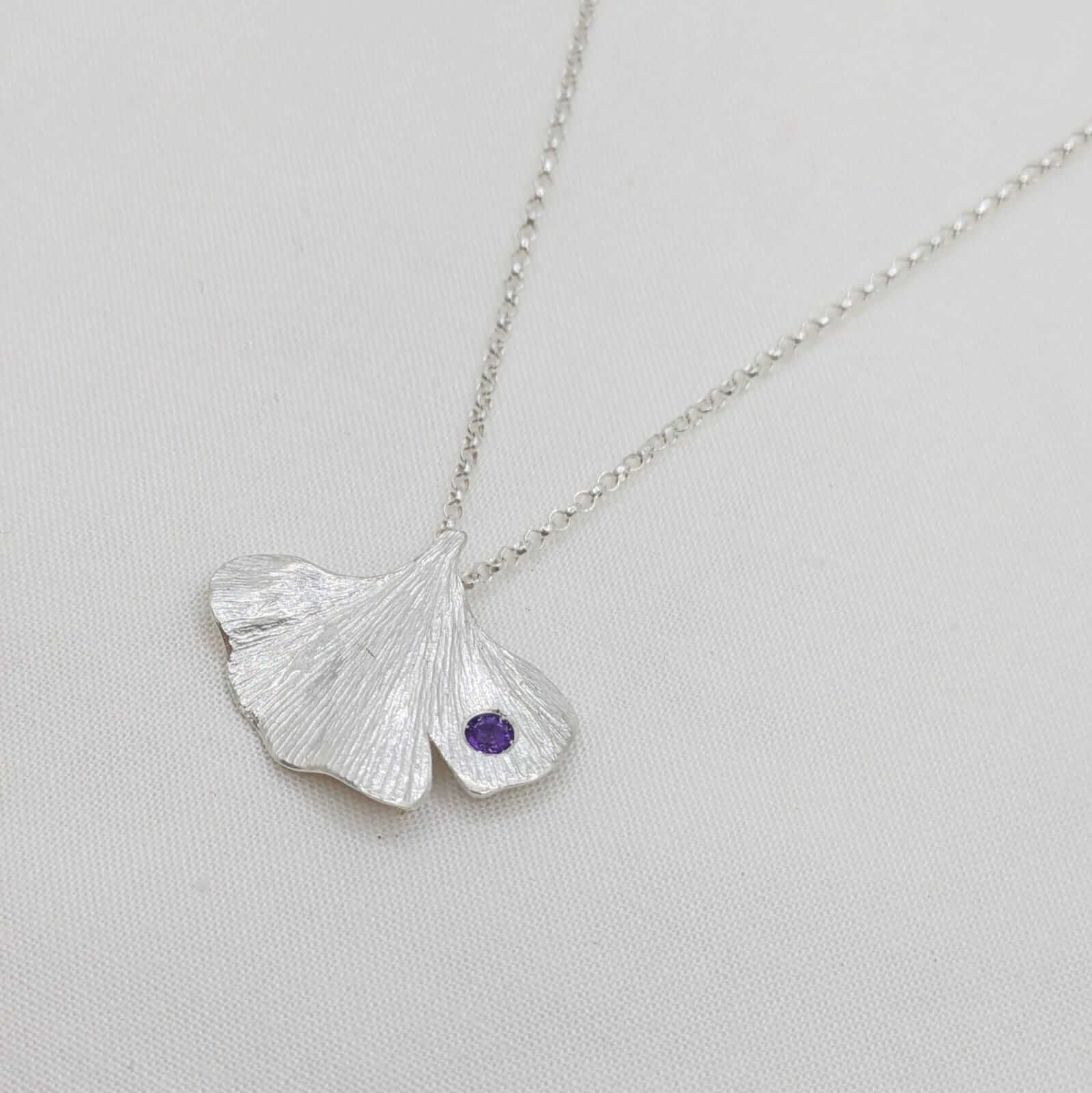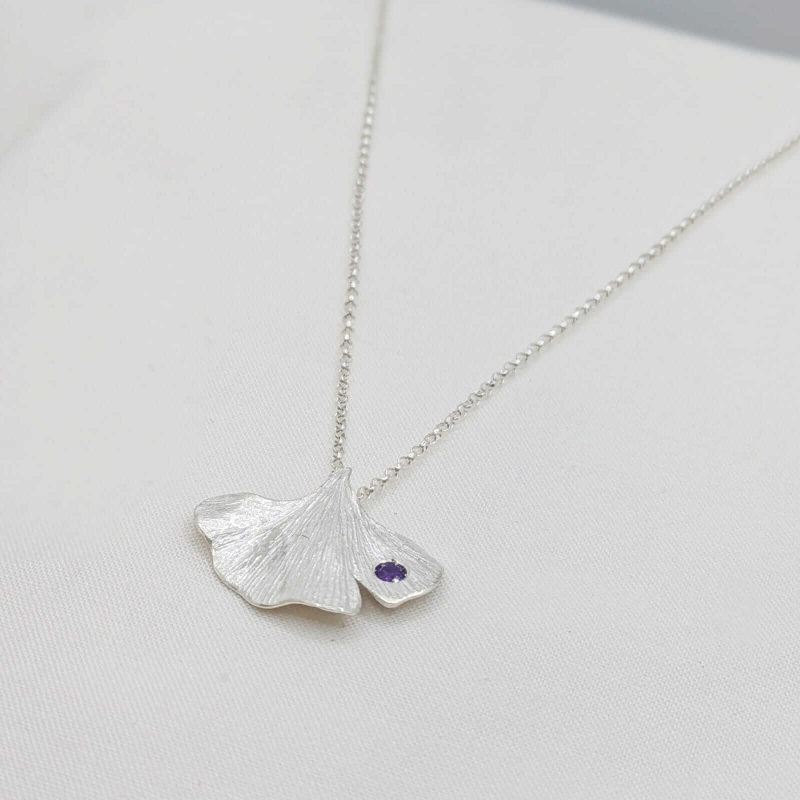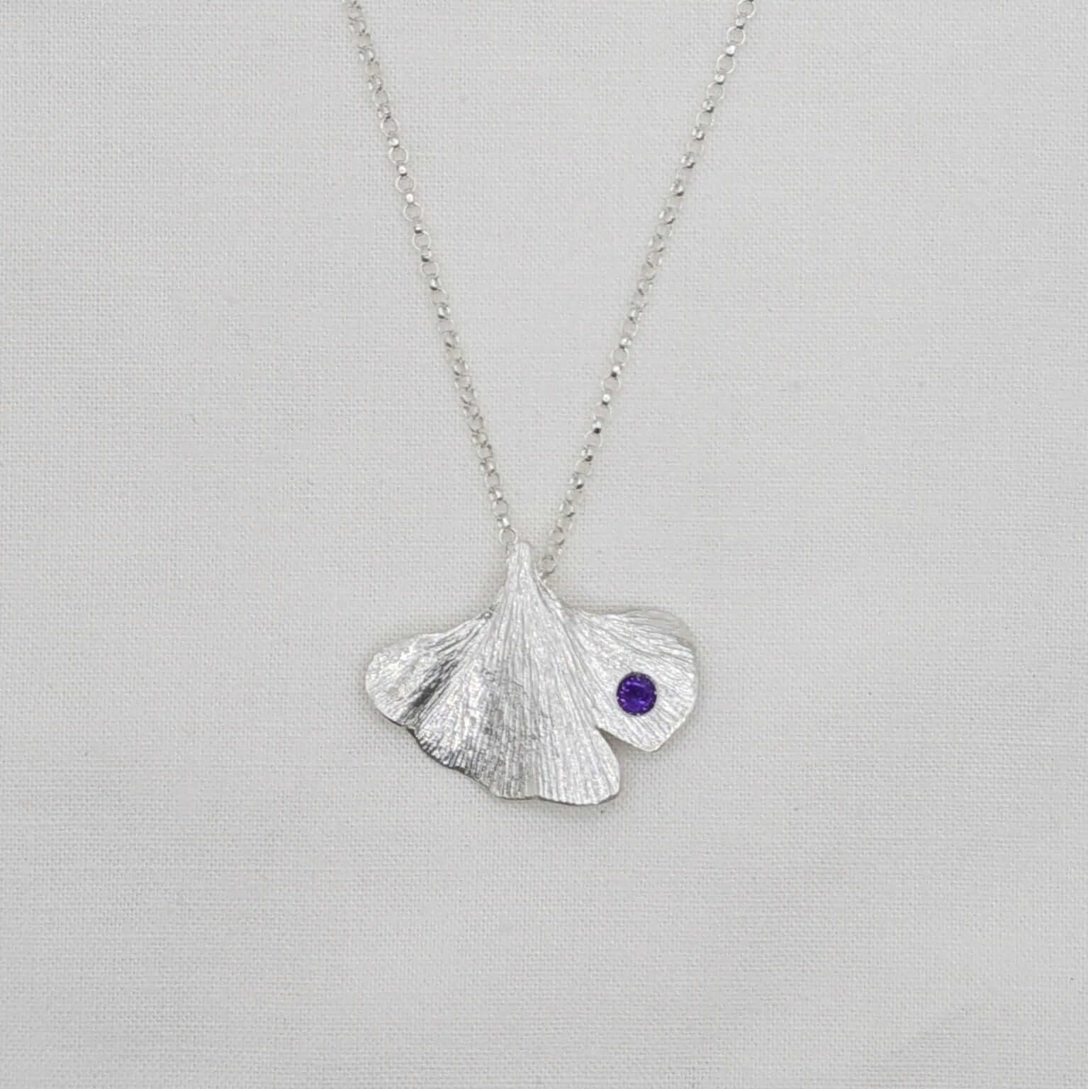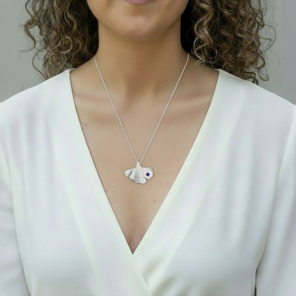 Al centre del disseny, una petita ametista de 3 mm aporta un punt de llum porpra, subtil però ple de significat. Aquesta pedra, associada a la calma i la claredat interior, complementa a la perfecció les línies orgàniques del ginkgo.