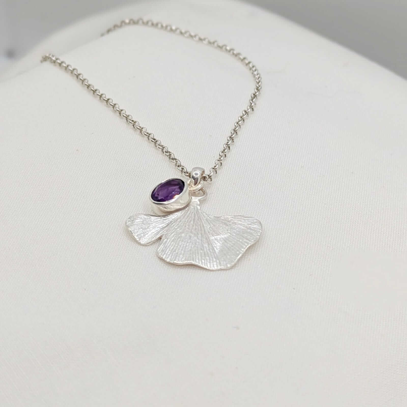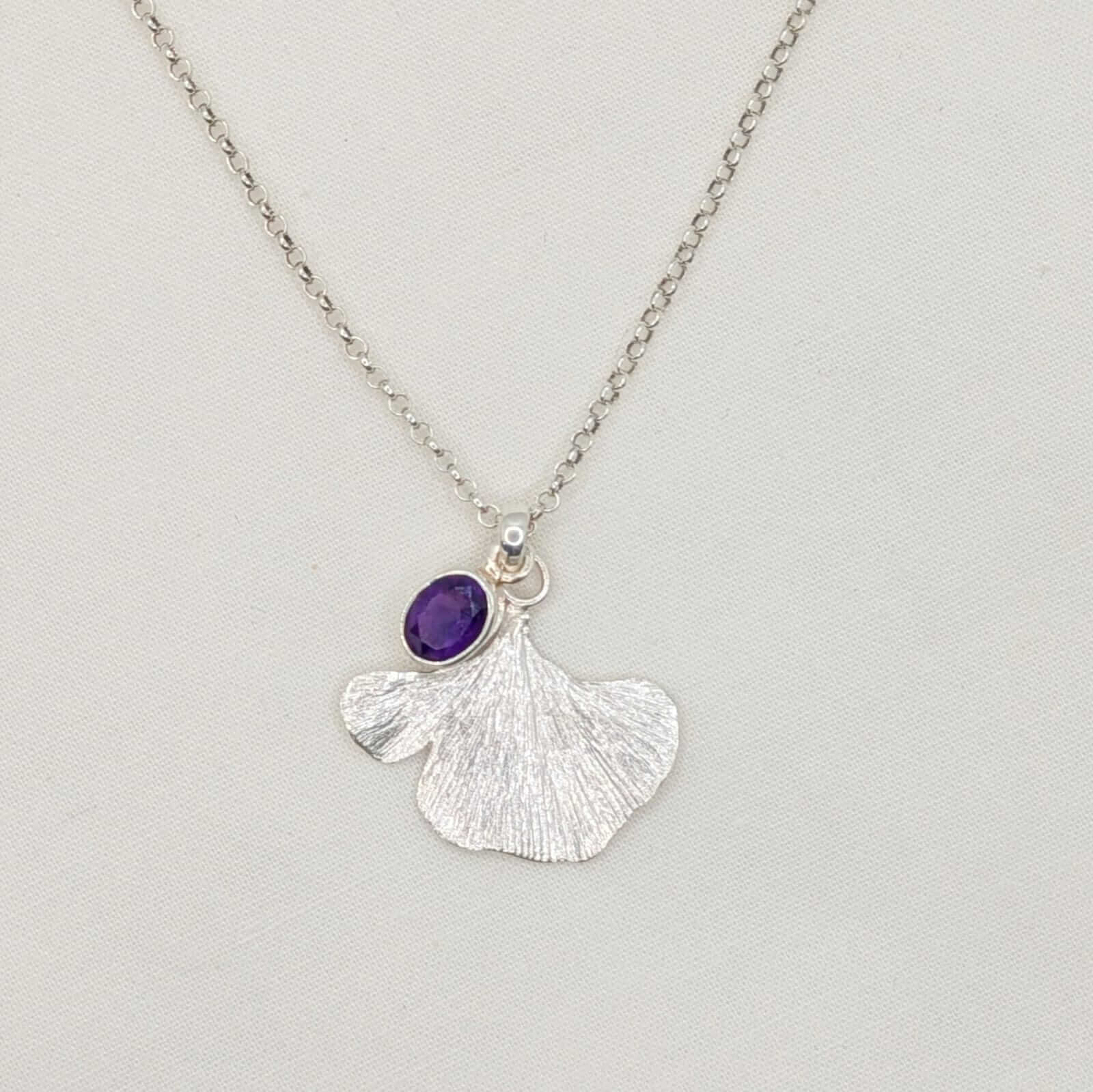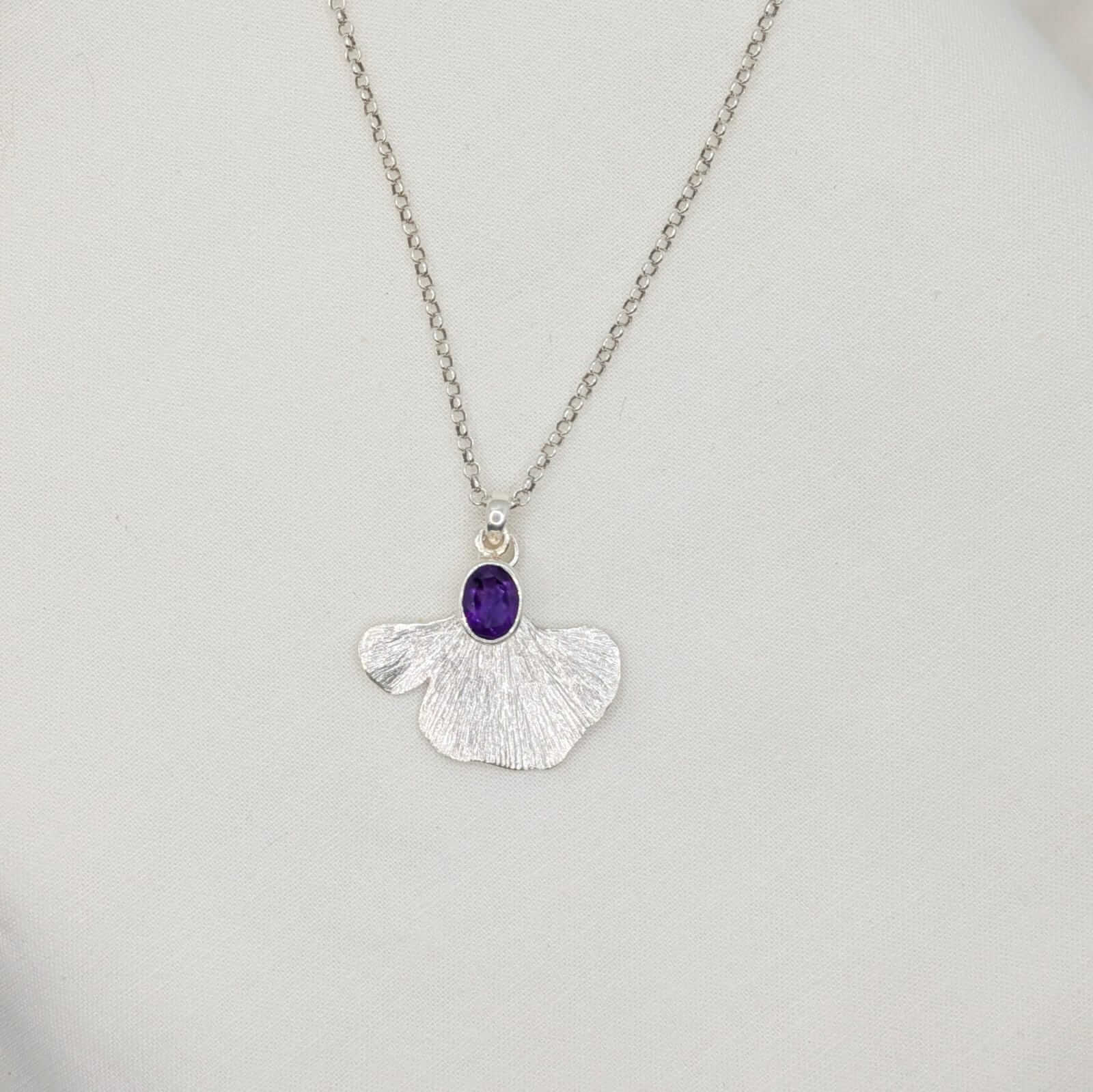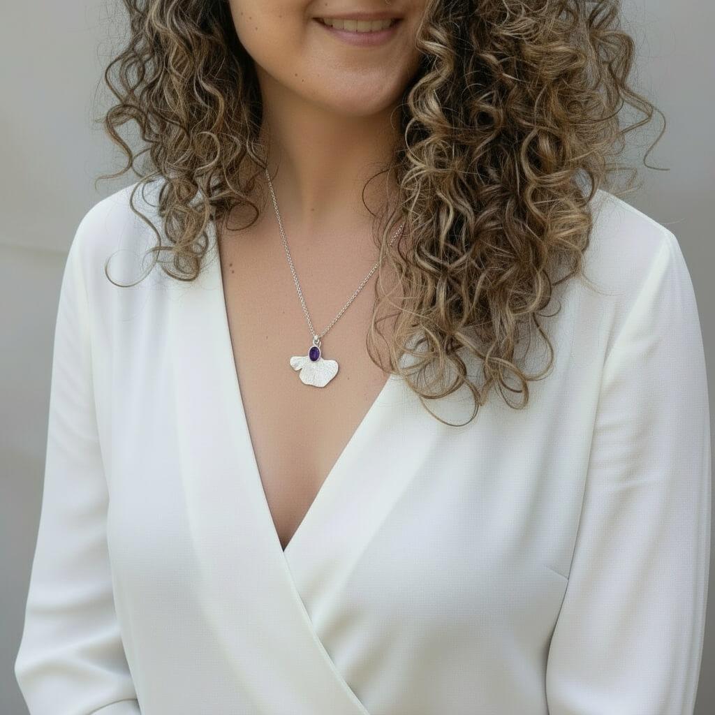 Aquesta peça única abraça una ametista de to porpra profund, com un pensament tranquil suspès en el temps. Acompanyant-la, el ginkgo biloba —amb la seva fulla inconfusible i plena d’història— s’estén amb una elegància natural, com si oferís refugi a la pedra per deixar-la respirar i brillar.