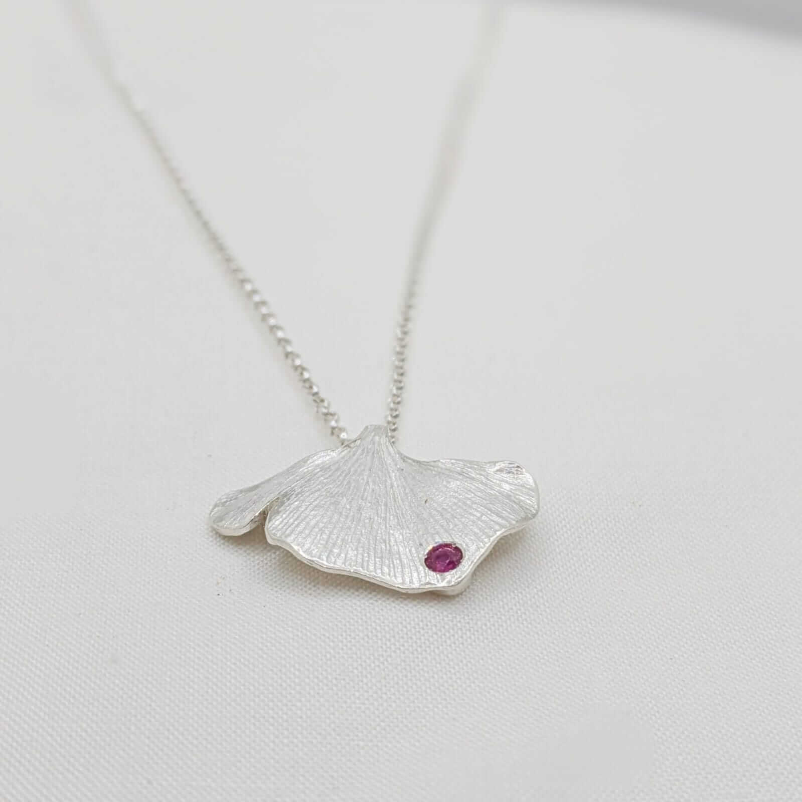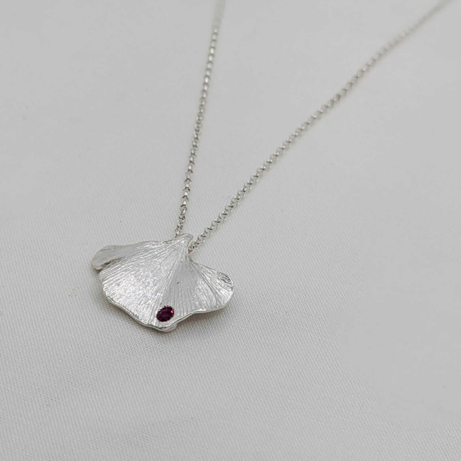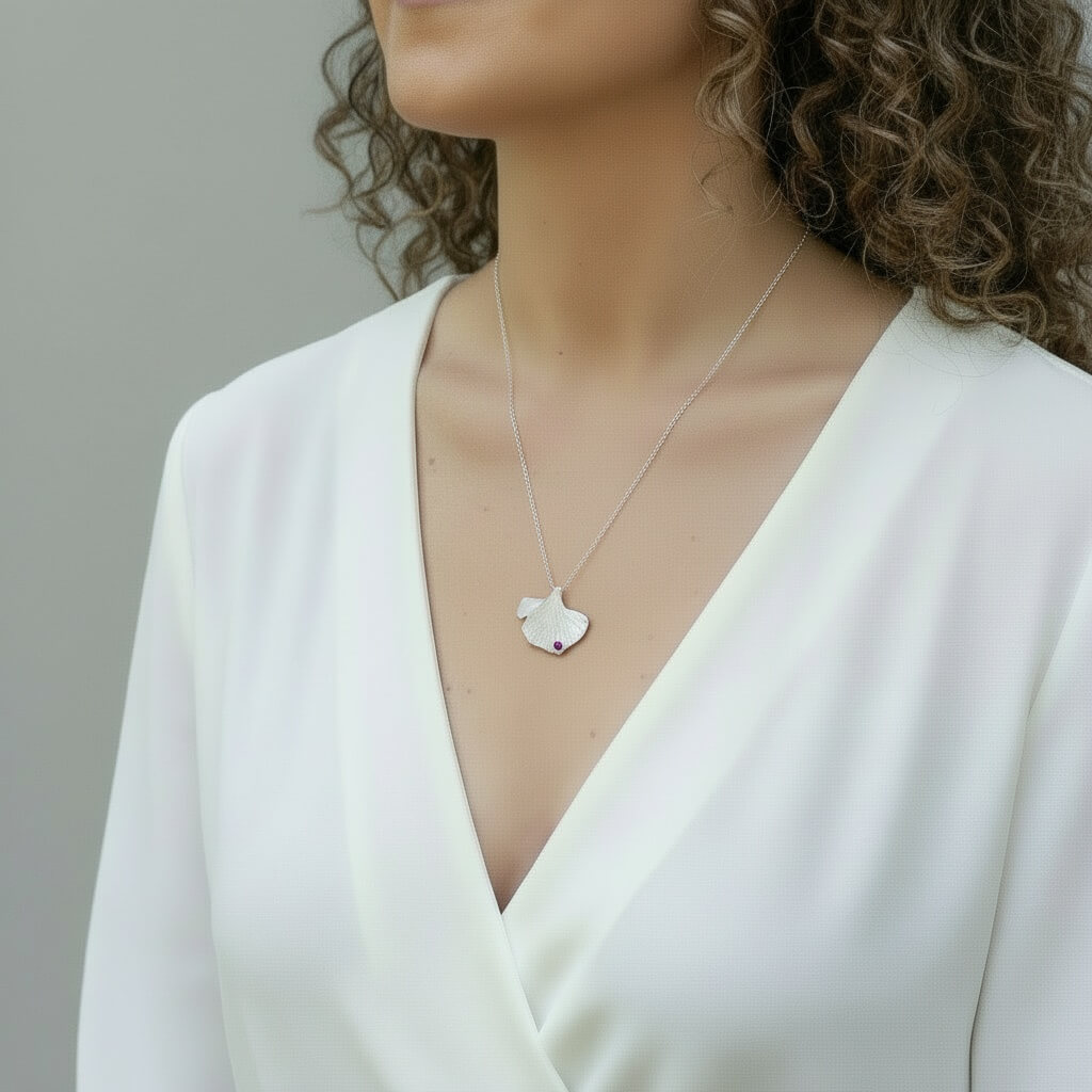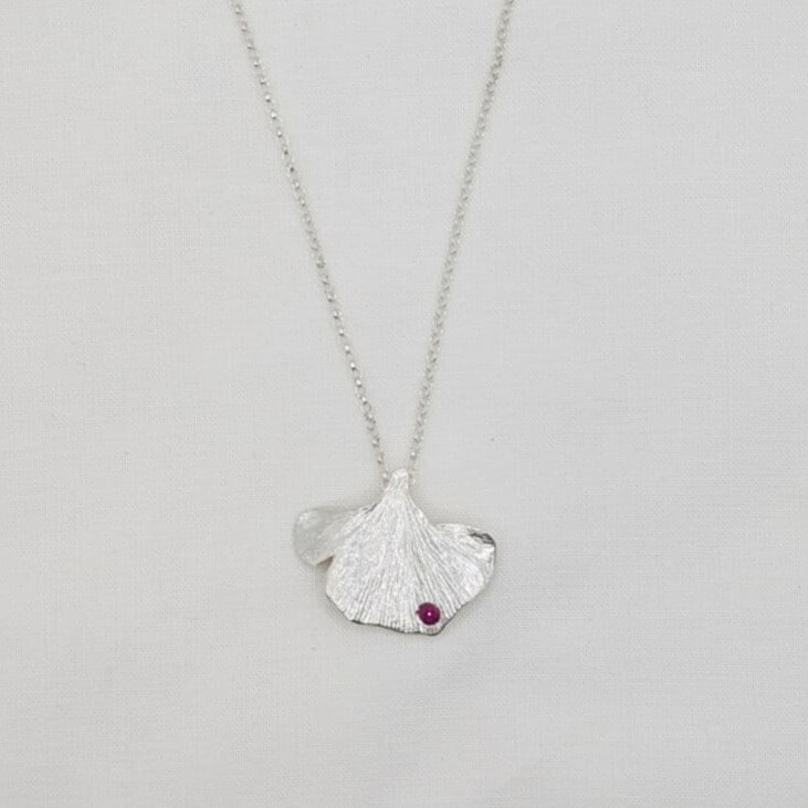 Aquest penjoll de plata amb un Rubí neix de la inspiració del fullatge de ginkgo biloba que creix al silenci històric del Monestir de Sant Cugat. La seva forma elegant i inconfusible es transforma en joia, capturant la bellesa d’un arbre mil·lenari que simbolitza longevitat, força i renovació.