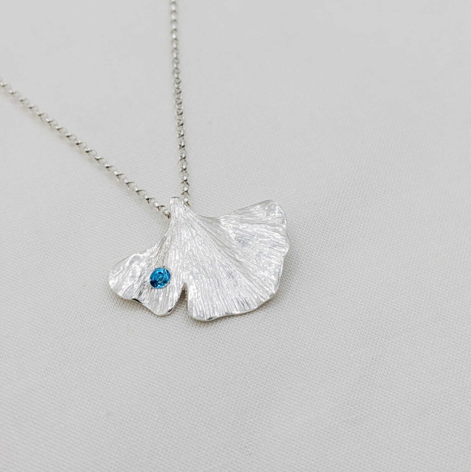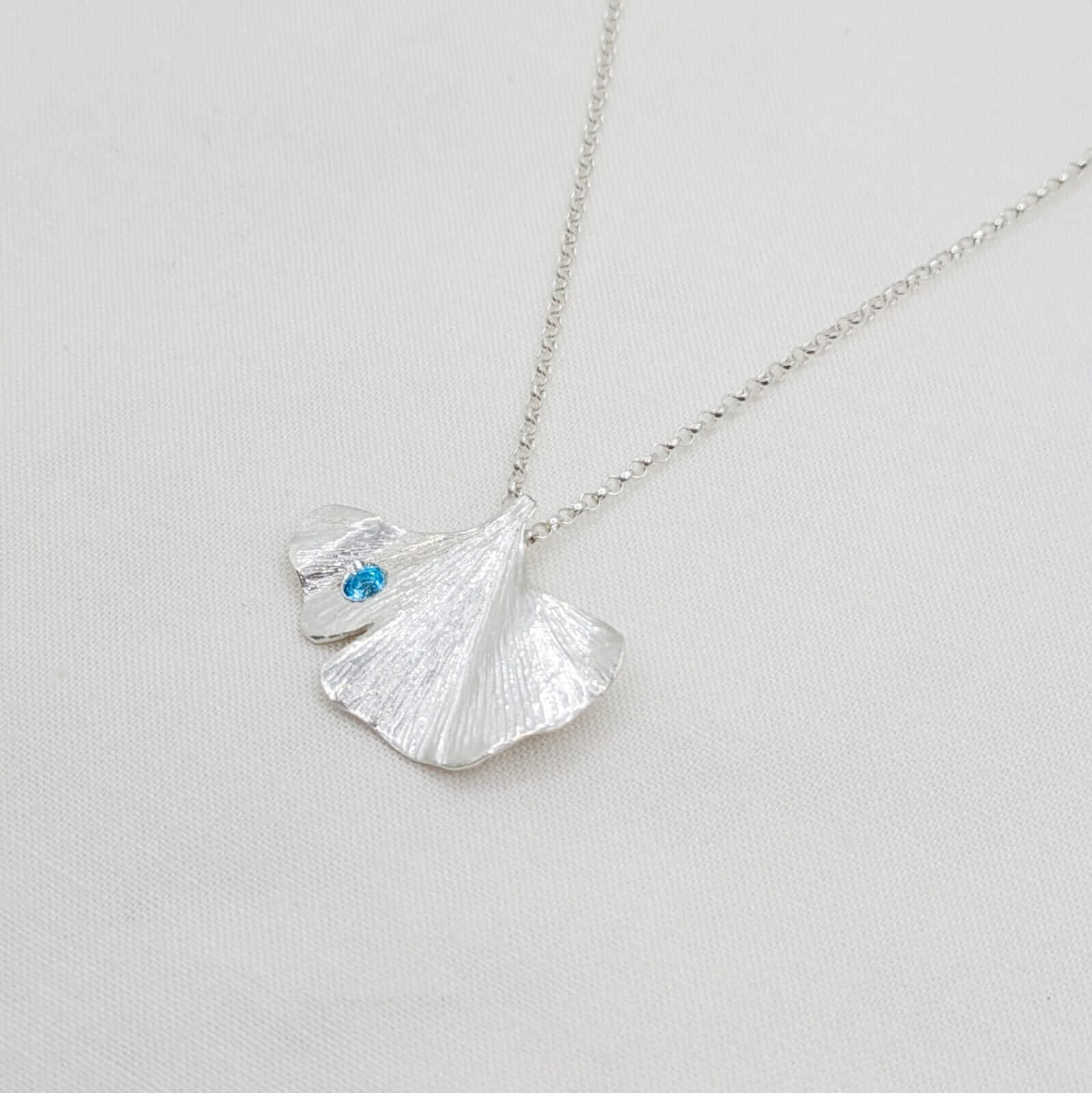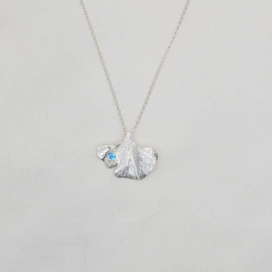 Als jardins silenciosos del Monestir de Sant Cugat, una fulla de ginkgo biloba inspira aquest penjoll: una línia lleugera de plata que sembla recordar el pas lent del temps.