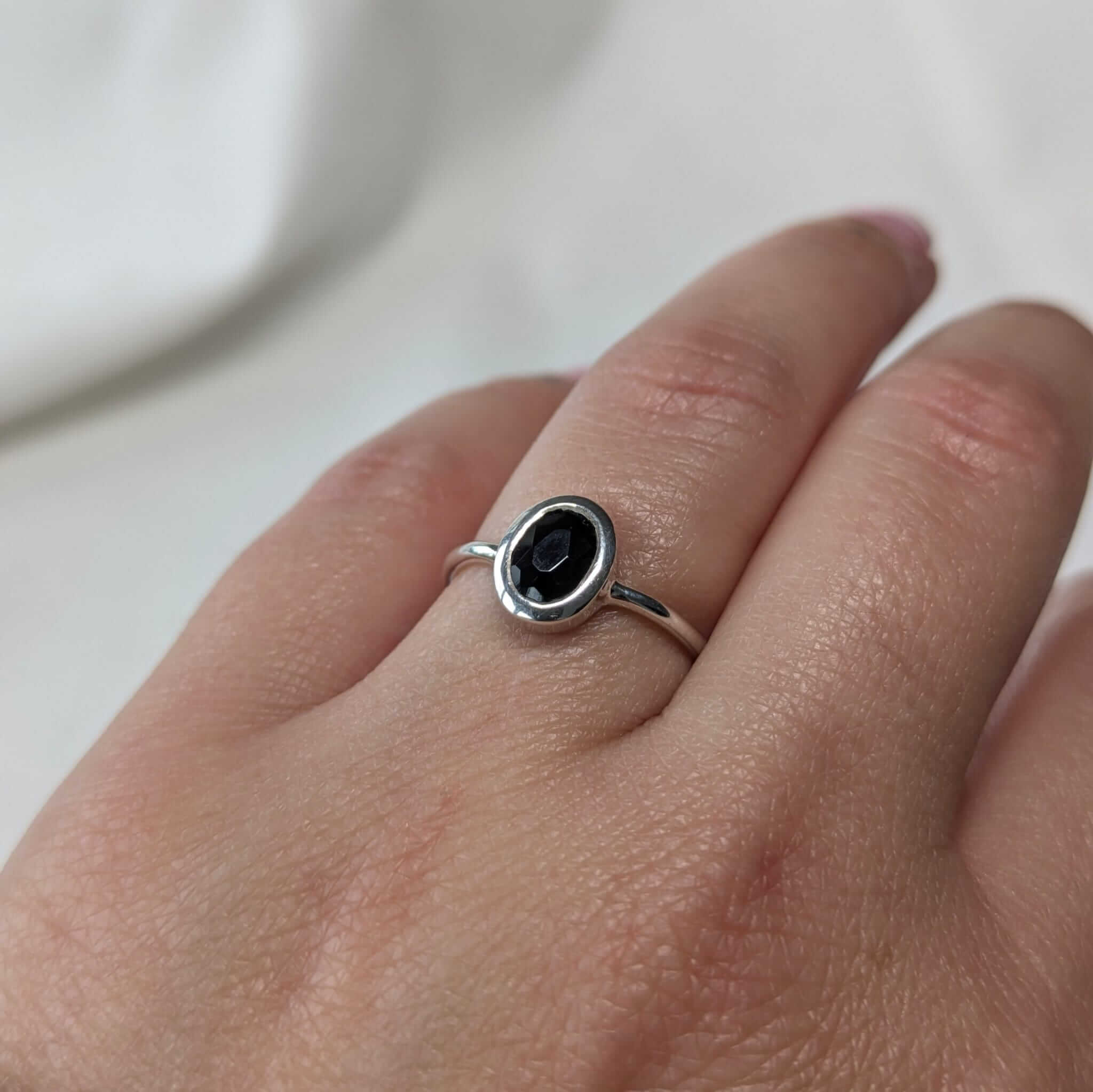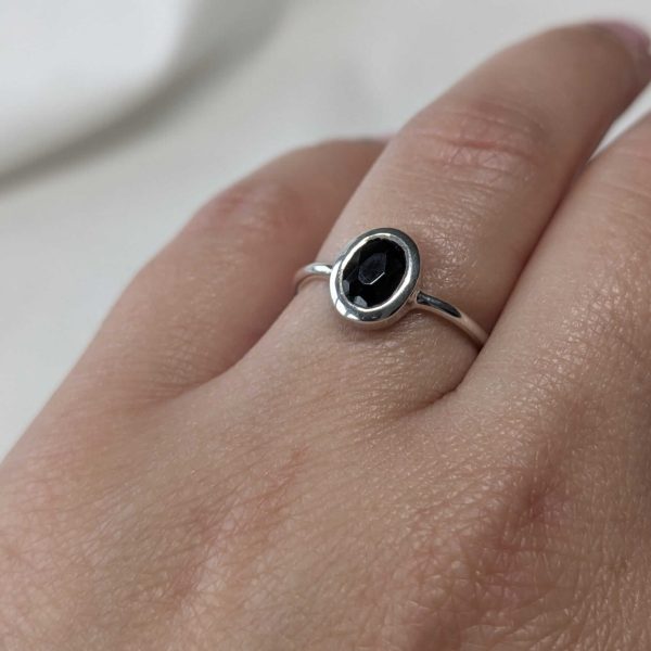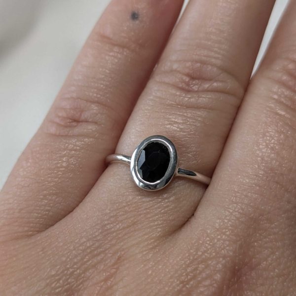 Anell de plata amb ónix facetat, una joia sofisticada que destaca per la seva elegància i brillantor. Perfecte per afegir un toc de misteri i estil a qualsevol look.