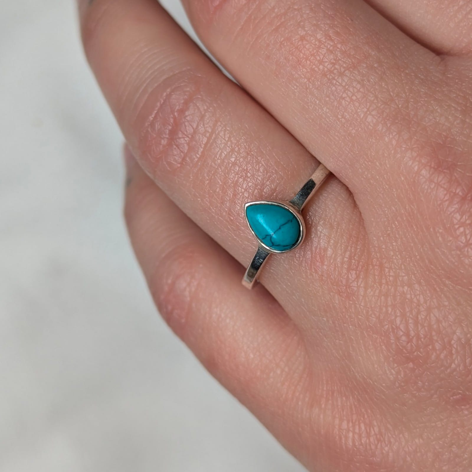Anell de plata de llei amb llàgrima de Turquesa, una pedra que evoca cels oberts i terres antigues. El seu blau intens, esquitxat de matisos naturals, transmet protecció, llibertat i una bellesa ancestral plena de caràcter.